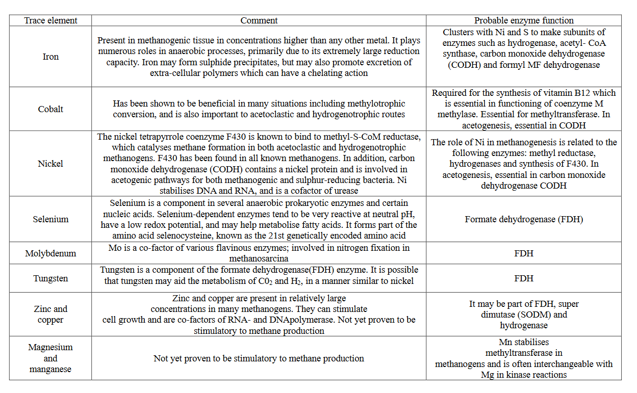 Table – Role of Trace Elements in Methanogenic Processe